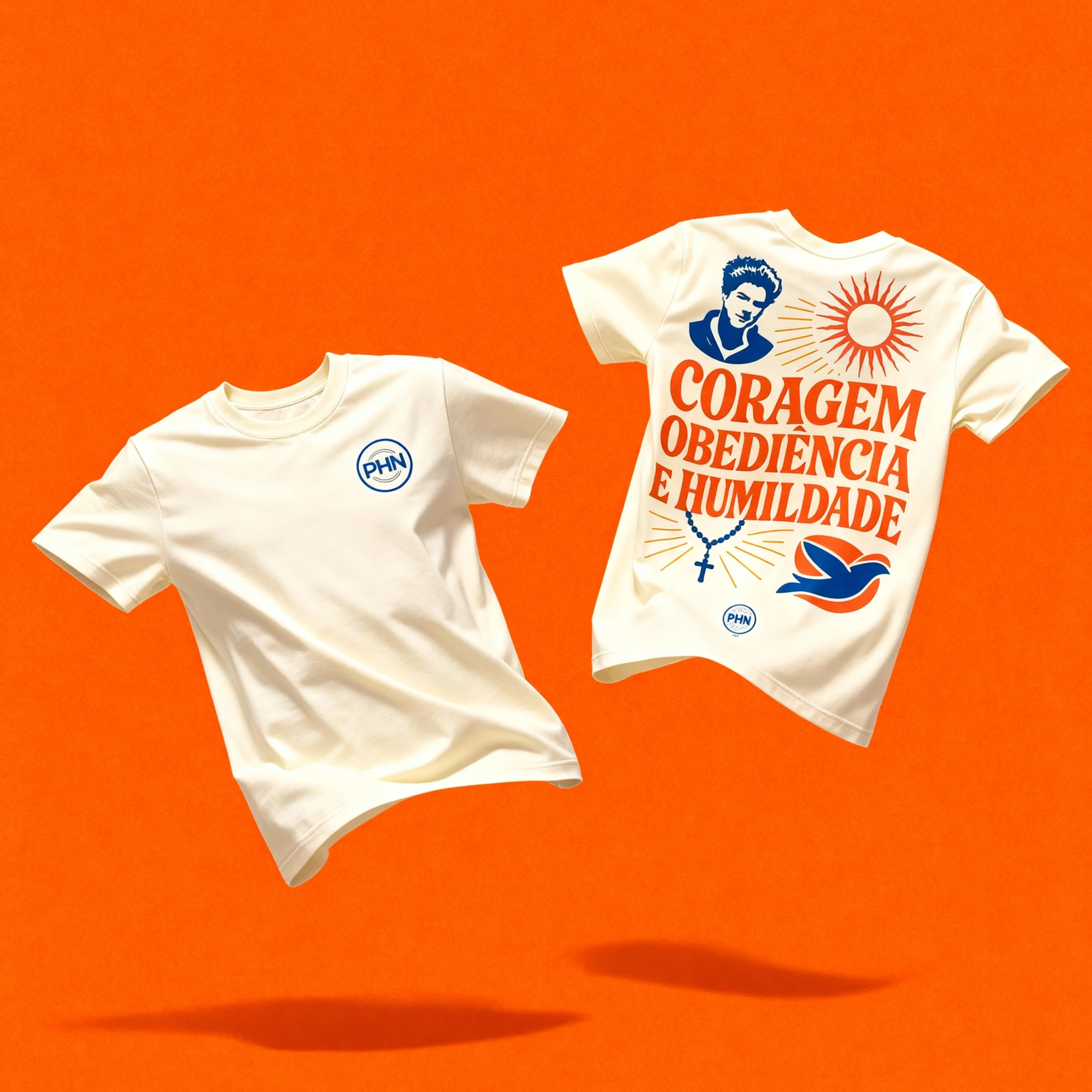 Nas costas, a imagem do São Carlo Acutis, exemplo de fé e pureza para a juventude, junto aos símbolos que expressam a essência do evento: o terço, sinal de oração; a pomba, presença viva do Espírito Santo; e o sol, que representa a luz da esperança que renasce em cada coração PHN.